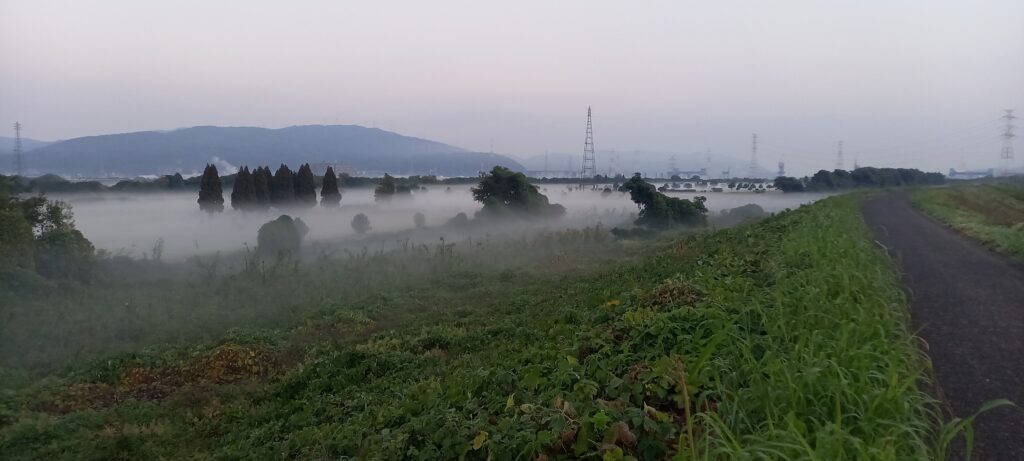朝晩、冷え込み始めると、日の出前に濃霧が発生することがある。11月14日の牧野パークゴルフ場。半年ぶりにゴルフをする予定だが、クラブを振り回すより、今はこの雲海を泳いでみたい気分。とはいえ、若者は走り去り、高齢者はつまづく、6時半
