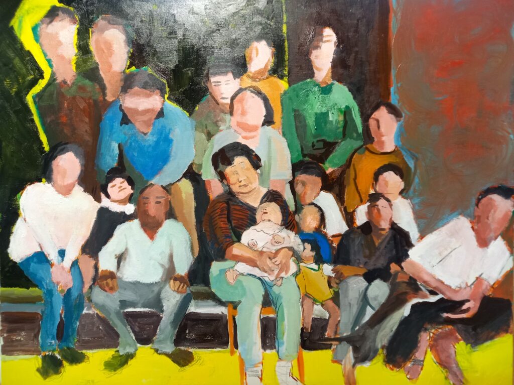 一族郎党を40号の油彩画に、と思って書き始めてみたものの、下描きが終わったところで、いつも気が重くなる。描き進めば進むほどつまらなくなっていく気がしてならないのだ。そこで、記念写真的に残しておくことに。行き当たりばったり技法で、さてどうなることやら