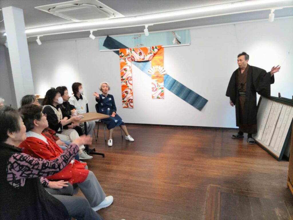 「友禅流し」をイメージした飾りつけの前で。三本の帯を、水面に揺れる友禅織と若鮎と川の流れに見立てました