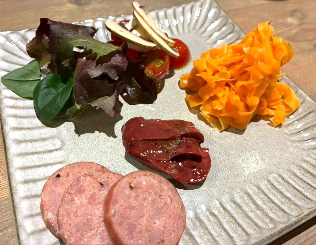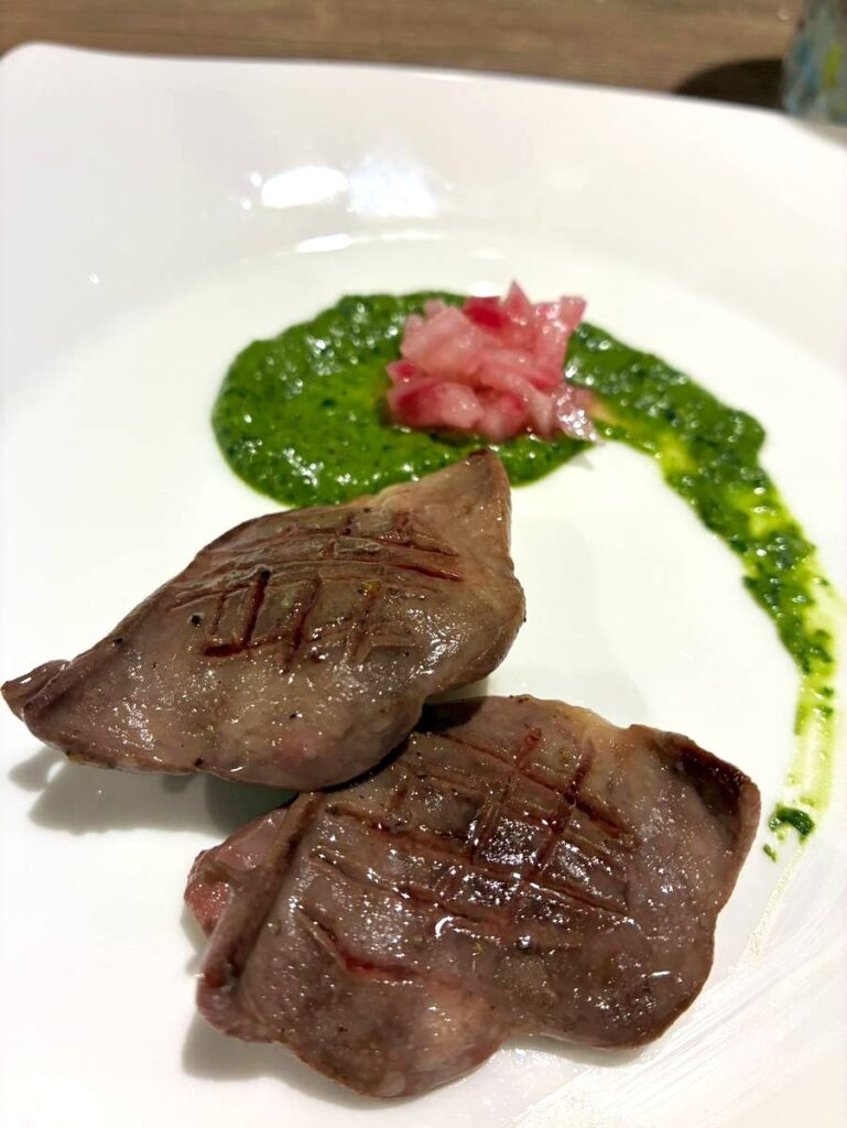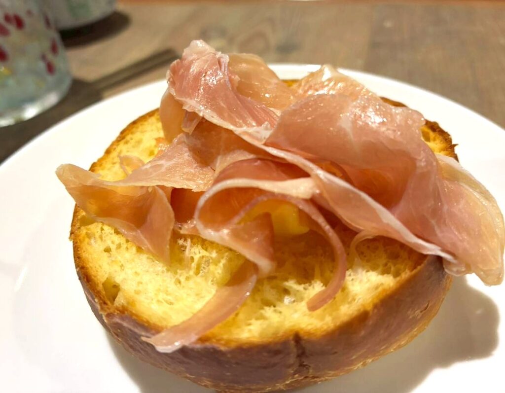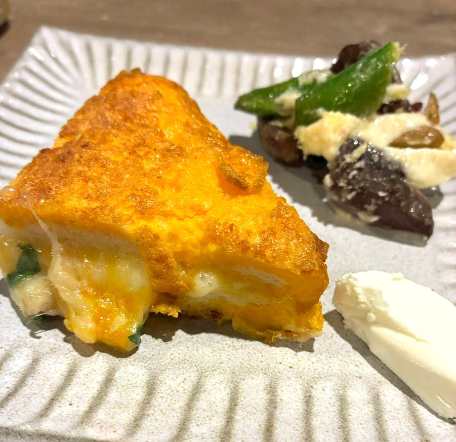 ④鴨の砂肝と肉厚椎茸のファルシとバジル、アンチョビ、チーズを詰めたインカロッツァ(イタリアの甘くないフレンチトースト)