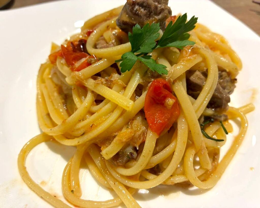 ⑥鴨手羽元とハツ元、フレッシュトマトのソース リングイネ