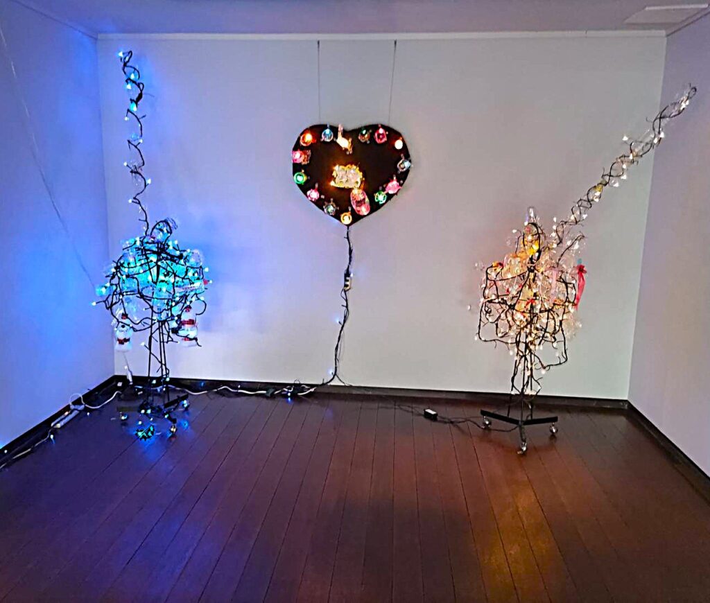 ペットボトルを利用してクリスマスツリー的飾りつけ。高級クラブのステージ?幸運のハートの電飾が満開になるのはほんの一瞬。見逃すな!